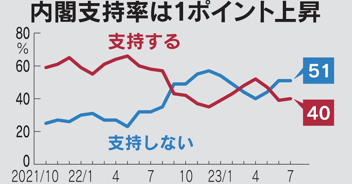 日本経済新聞社とテレビ東京は28~30日に世論調査をした。岸田文雄内閣の支持率は40%で、6月の前回調査から1ポイント上がりほぼ横ばいとなった。内閣を「支持しない」と答えた割合は51%で増減がなかった。