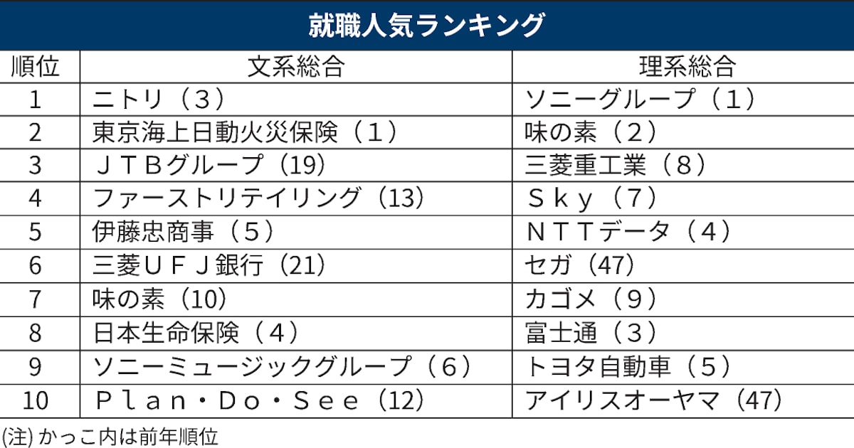 24年春卒の就職人気ランキング、ニトリ・ソニーG首位 - 日本経済新聞