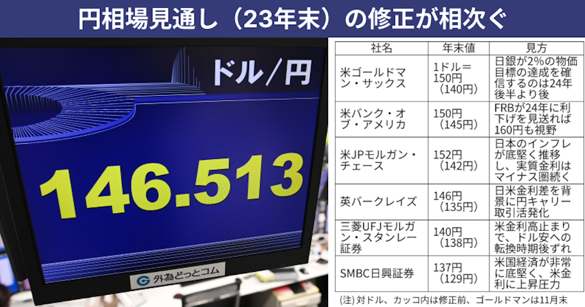 国内外の金融機関による為替相場の見通しが、一段と円安方向に傾いてきた。米ゴールドマン・サックスが半年後に1ドル=155円まで円安が進むとするなど、予想の修正が相次ぐ。物価上昇を考慮した金利(実質金利)で米欧との差が縮まらず、通貨としての投資妙味が薄らいでいるためだ。政府による円買い介入で、円高方向に反転するリスクはなおくすぶる。