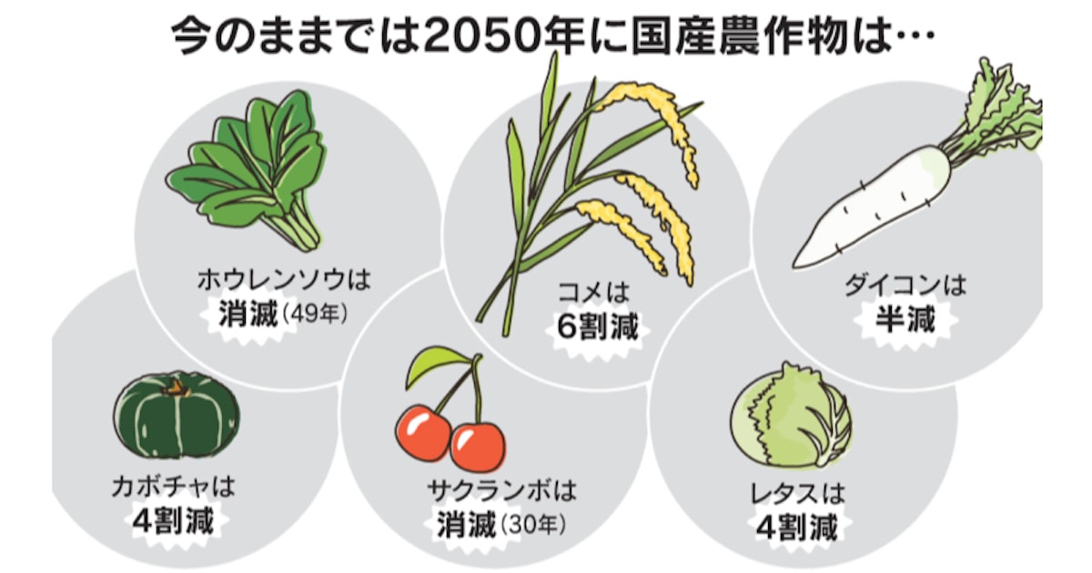 食卓から国産の農作物が消えていく。民間の推計では2050年、国内の農業人口が現状より8割も減る。生産は激減、必要なカロリーを賄うためにイモが主食の時代がやってくるかもしれない。世界で人口が増える中、輸入頼みを続けられるか。飽食の意識を変える必要がある。