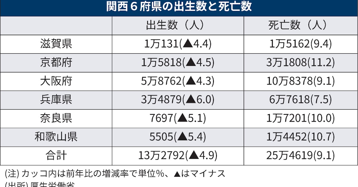 厚生労働省が28日に発表した人口動態統計速報によると、関西6府県の2022年の出生数は前年比4.9%減の13万2792人となった。